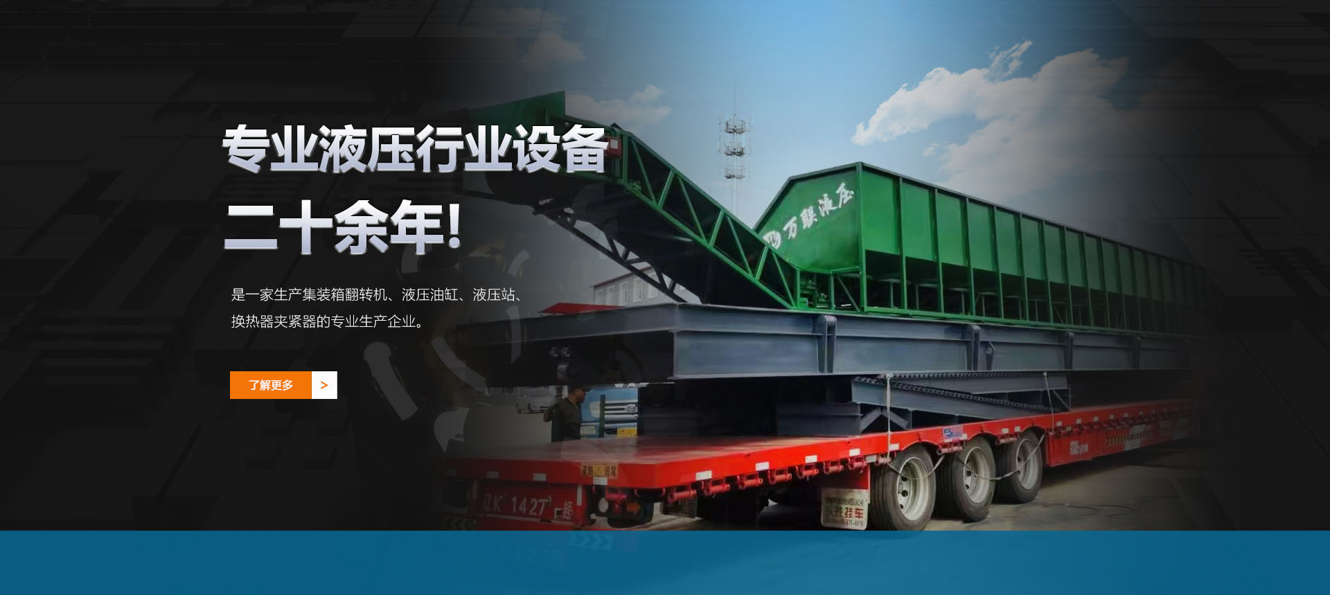 遼寧萬聯液壓熱力制造有限公司是一家生產液壓翻板機、集裝箱翻轉機、液壓油缸、液壓站、液壓夾緊器的專業生產企業。2010年在遼寧昌圖縣老四平工業園新建車間
